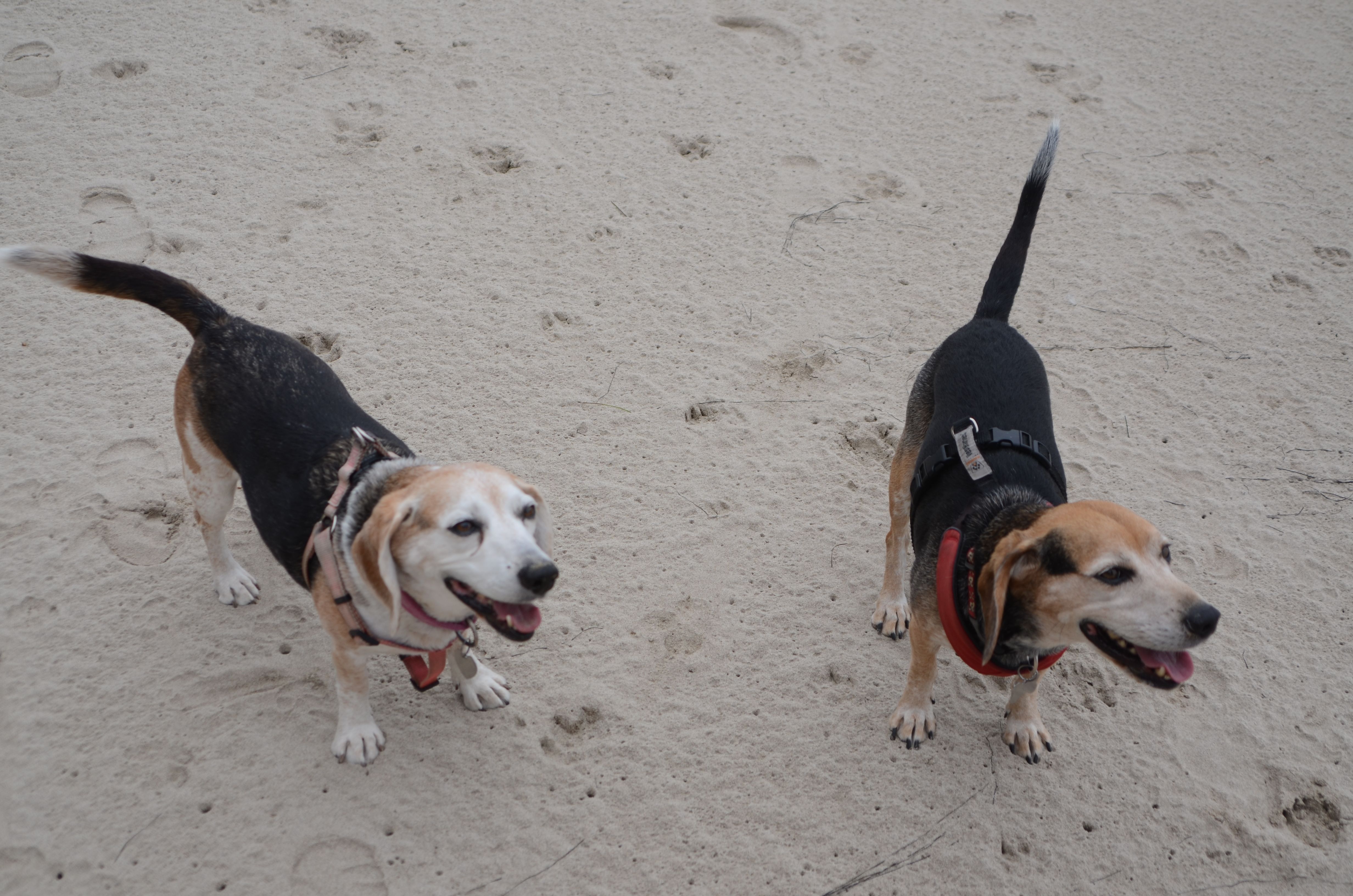 We walked the BEAGLES far enough from the on leash and parking lot area that we could cut them off at the pass, if necessary. We took off their leashes, each of us keeping one of the leashes in case we had to chase someone down.